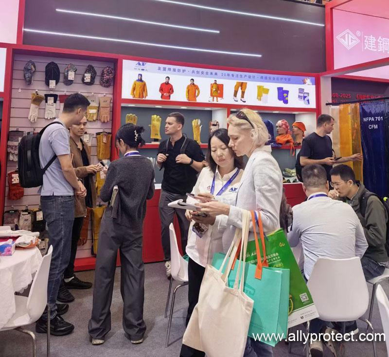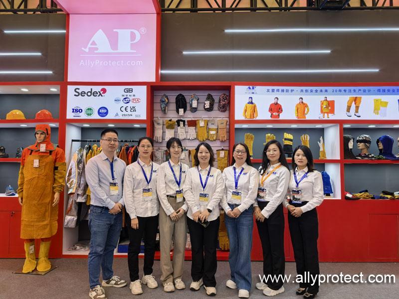 展會現(xiàn)場,友盟防護以紅色為主色調的展位格外醒目,品牌標識“AP(AllyProtect)”與“友盟焊接防護·共創(chuàng)安全未來”的標語熠熠生輝,直觀傳遞出品牌專注焊接防護裝備研發(fā)生產(chǎn)20年的專業(yè)底蘊。展位內,系列焊接防護手套、防火阻燃防護服、防護面罩等核心產(chǎn)品整齊陳列,從基礎防護裝備到高性能定制產(chǎn)品,全面覆蓋焊接作業(yè)不同場景的防護需求,每一件產(chǎn)品都彰顯著友盟對品質的嚴苛把控與技術創(chuàng)新的深耕。